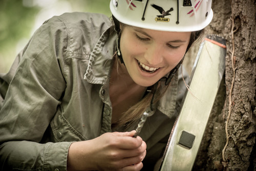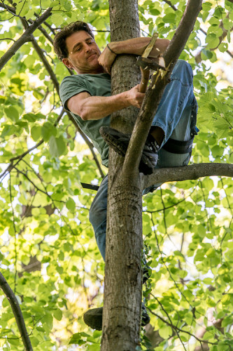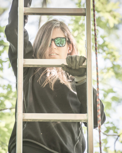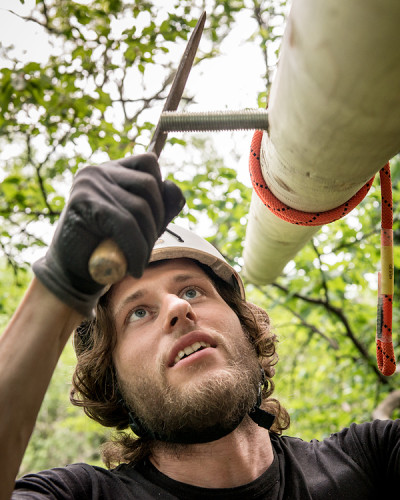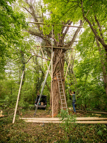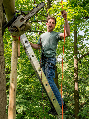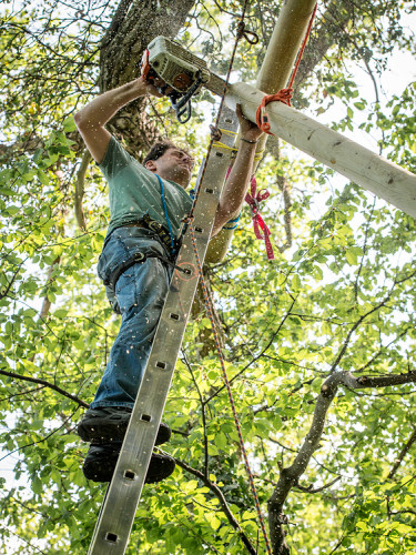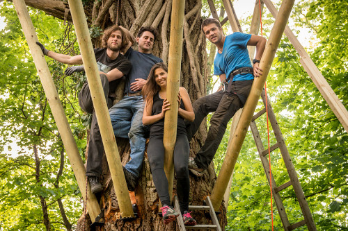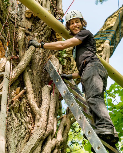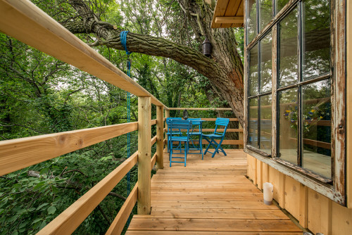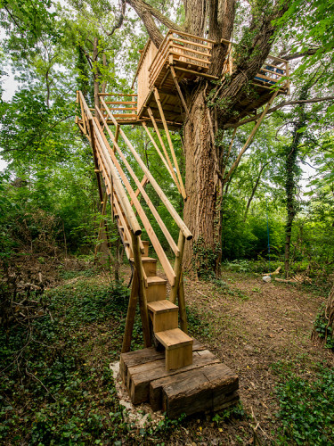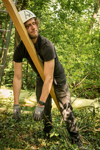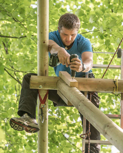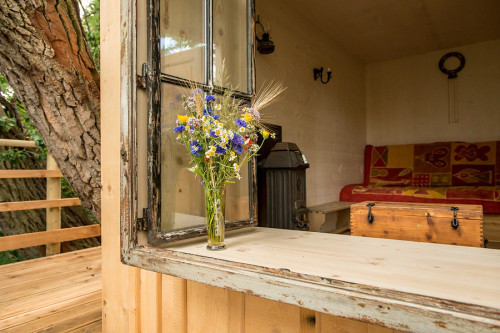 The double bed made of thuja wood with a spacious bed drawer can be pushed together to form a sofa. A restored old wooden locker from a demolished house provides the necessary storage space. Candles and lanterns as well as lanterns provide cozy lighting for the interior and terrace. The ten meter long larch staircase rests on a disused telegraph pole and leads over a neighboring tree, from which you can reach the terrace via a sloping bridge.
