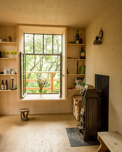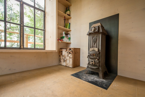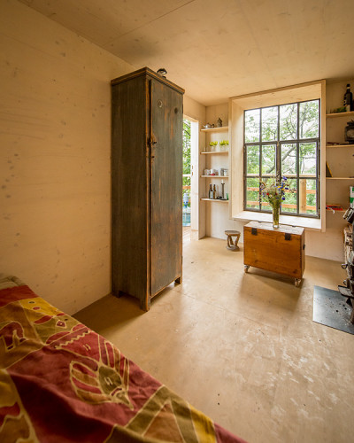 From the spacious terrace you can look down on the stream, meadow and fields between the branches of a huge, old white poplar tree. The hut, a timber-framed building made of rough-sawn spruce boards, is insulated against cold and heat with hemp panels. The rear ventilation of the walls ensures air circulation and a pleasant room climate. Spruce three-layer panels line the interior walls. A small, old wood stove that I found at a flea market provides heat and hot tea water. The old steel windows come from a mill building and were equipped with insulating glass. One of the window reveals serves as a comfortable seat.