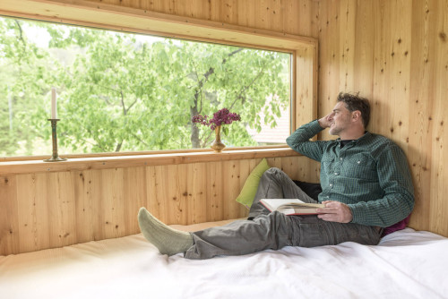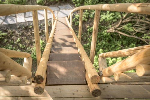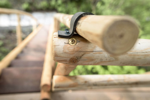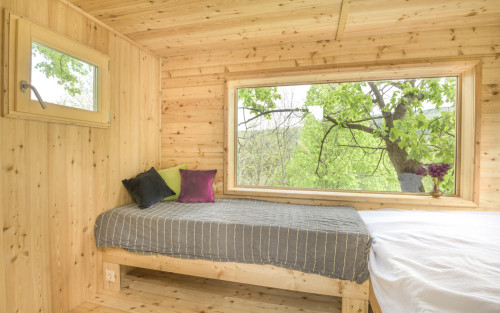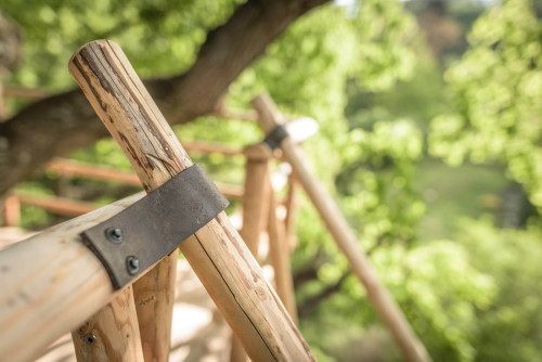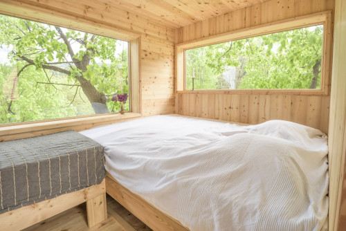 In order to manufacture the substructure, we had once again to rely on climbing using ropes, as the majority of the attachment points were not accessible via ladders. The terrain surrounding the massive tree trunks was simply too steep, and as we also worked under snow conditions, it was rather slippery, too. In spite of our frozen fingers, working in pristine nature inspired us every single day anew. We really enjoyed spending time outdoors, listening to the singing birds that visited us high up in the tree top. As I have contemplated for quite a long time now to enlarge my offer of huts, we took pictures of the “naked” platform and then projected the picture of a yurt thereon. This yurt was bespoke tailored by the Jurtenwerkstatt in passionate handiwork. It can be seen in the project called “tree yurt”. After accomplishing the works on the platform, size and position of the hut could be defined together with the enthusiastic client. It was later been produced in my workshop out of larch three-layer plate, provided with two “panorama” windows and three beds and had to be taken apart again for transportation. Four men were necessary to drag the individual parts over an improvised ladder construction up to the platform, where they were put together and provided with a trapezoidal sheet metal roof.