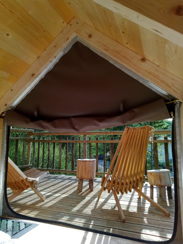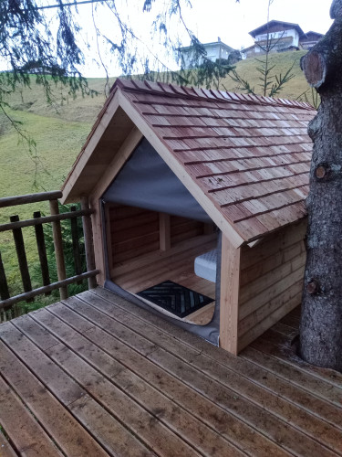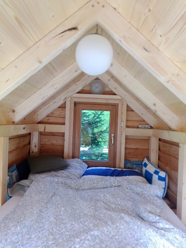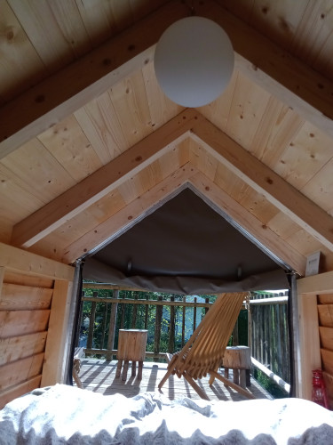Die Cabin gleicht einem befestigten Zelt, in dem nicht viel mehr als ein bequemes Doppelbett Platz findet. Sie ist aus massiver Lärche mit gehacktem Schindeldach und Stulpschalung konstruiert, um den schneereichen Wintern über viele Jahre standzuhalten. Die am Fussende eingebaute robuste Plane sorgt für Zeltstimmung.