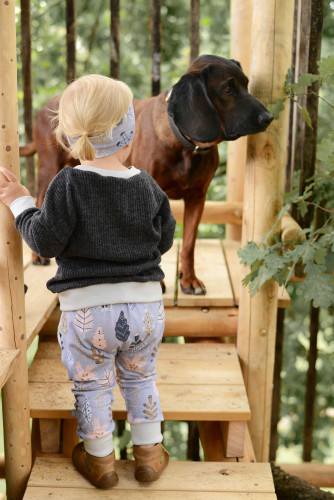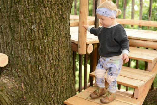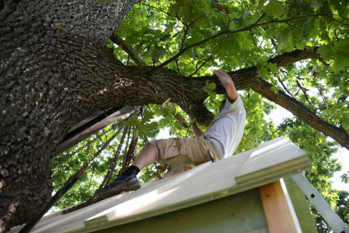 Schnell war der Entschluss gefasst, beiderseits des Stammes je eine Plattform zu bauen. Eine sollte die Kinder zum Spielen einladen und von der Terrasse aus über eine Stiege erreichbar sein. Von dieser würde man dann über eine kleine Treppe auf die höhergelege Plattform gelangen, wo das auf drei Seiten von einem Balkon umgebene Baumhaus hinkommen sollte. Von hier aus würde man einen schönen Blick über die Ortschaft hinweg bis ins Mürztal haben würde.