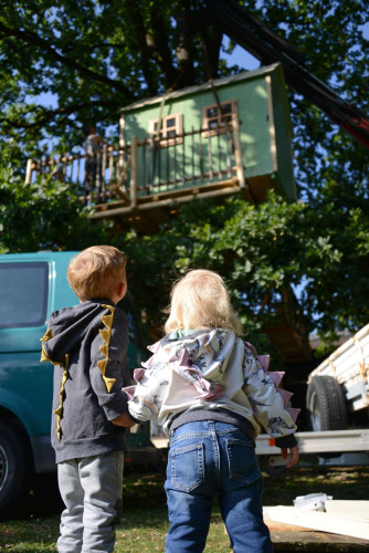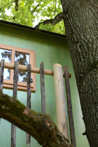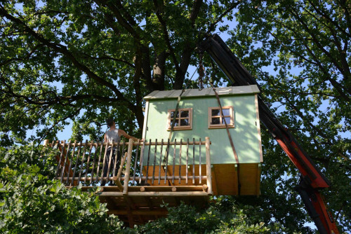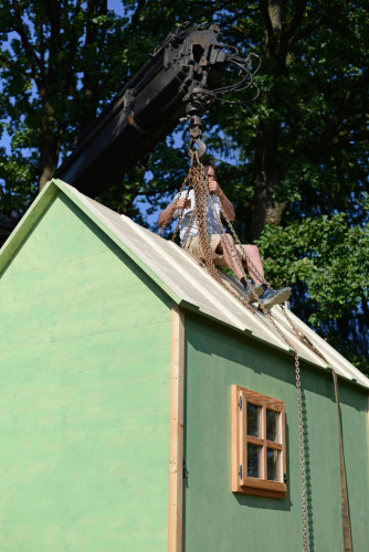 Die Hütte aus grün lasierter Fichte mit handgemachten Fenstern und Türe aus dem Mostviertel ließ sich einige Wochen darauf mit einem Kranwagen auf die Plattform heben, was bloß eine halbe Stunde dauerte und dem glücklichen Umstand geschuldet war, dass man problemlos zufahren konnte.