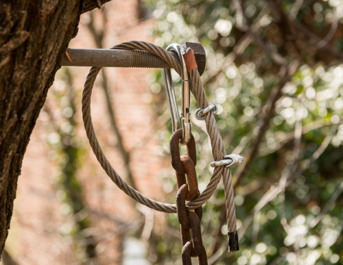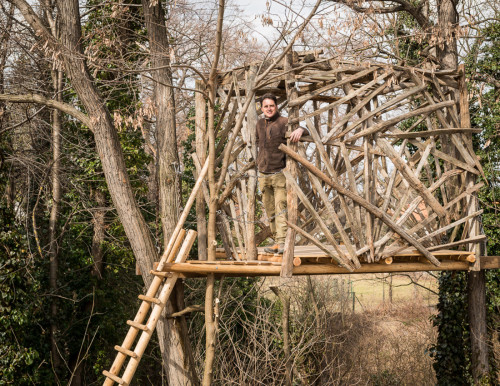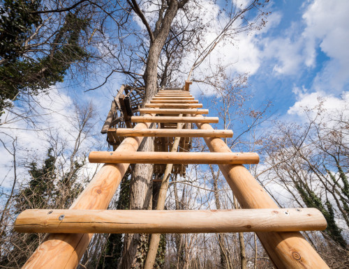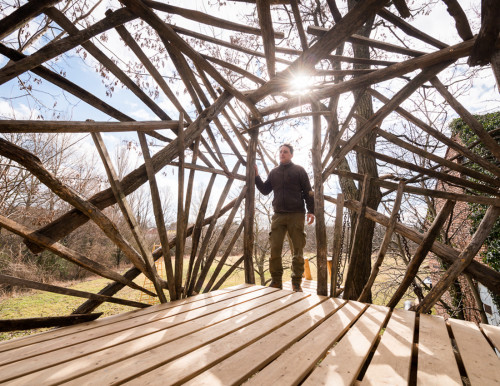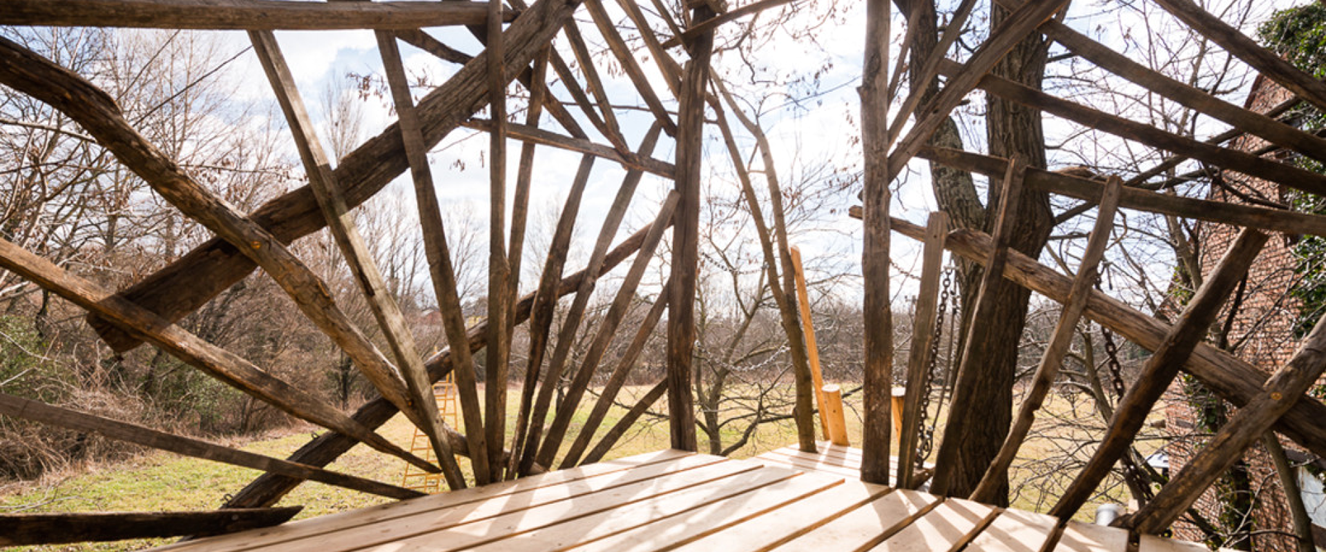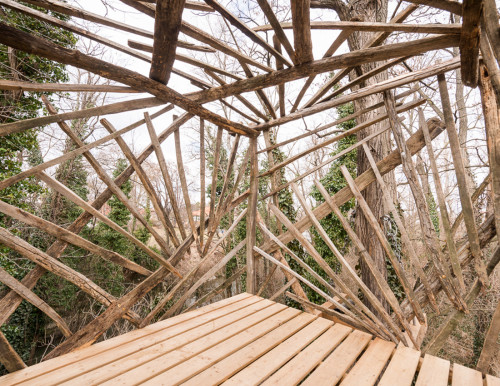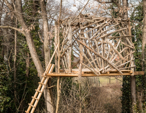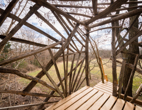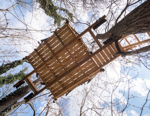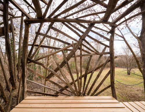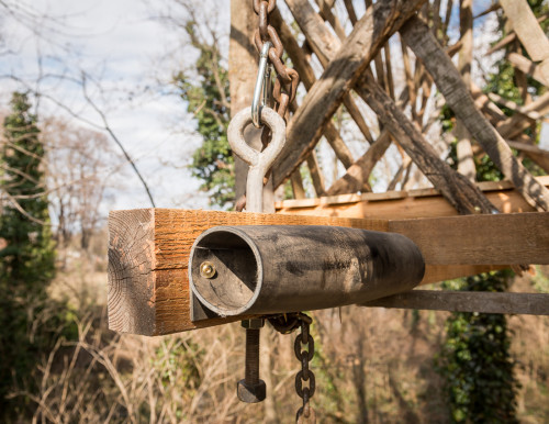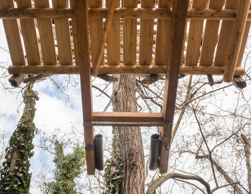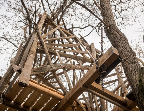 Erst wurden zwei lange Lärchenkanthölzer ähnlich wie bei Baumhaus „FloJo“ mittels Ketten zwischen die beiden Robinienstämme gehängt. Darüber kamen Polsterhölzer und Terrassenbohlen aus Lärchenholz. Ein schmaler Steg mit Kettenhandlauf verbindet die einfache Holzleiter mit der Plattform, die von asymmetrisch angeordneten Weingartenhölzern würfelförmig überspannt wird und die Windbewegungen ihrer Ankerbäume durch sanftes Schaukeln beantwortet. Wenn man die Augen zu einer Siesta „an Deck“ schließt, möchte man meinen, man befinde sich auf hoher See…