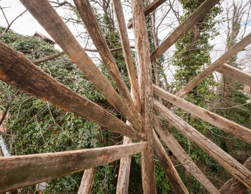 Für die quadratische, etwa sieben Quadratmeter große Plattform ergab sich für mich erstmals die Gelegenheit, meinen „Schatz“ uralter Weingartenpfosten aus Robinienholz zu verarbeiten, die ich letztes Jahr am Weg zu „Tobias Eichhörnchens Baumhöhle“ entlang der Straße entdeckt und von einem Weinbauern erstanden habe.