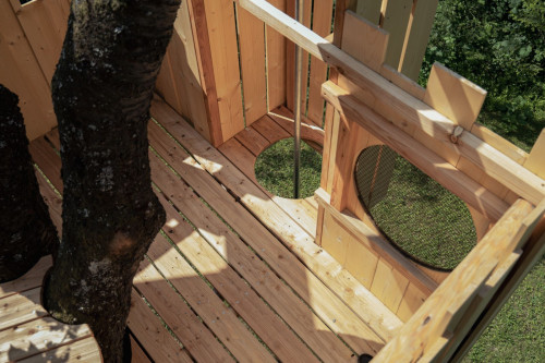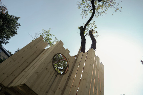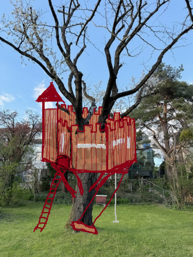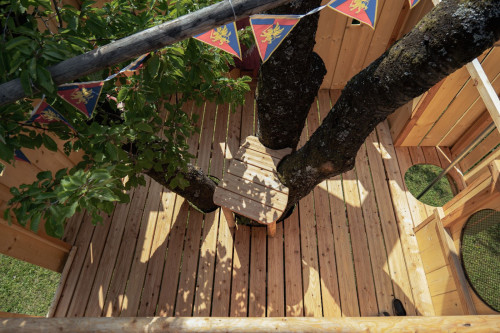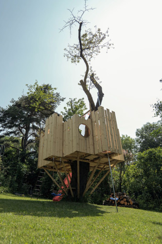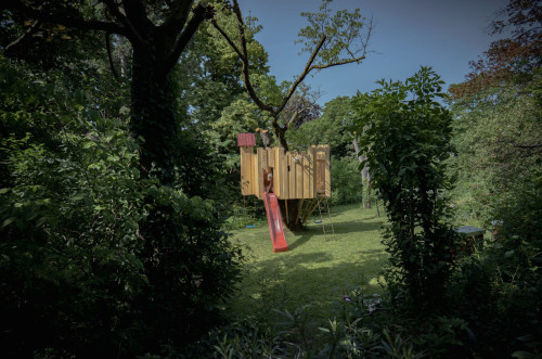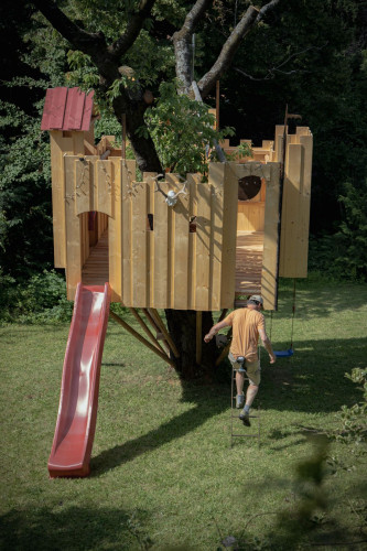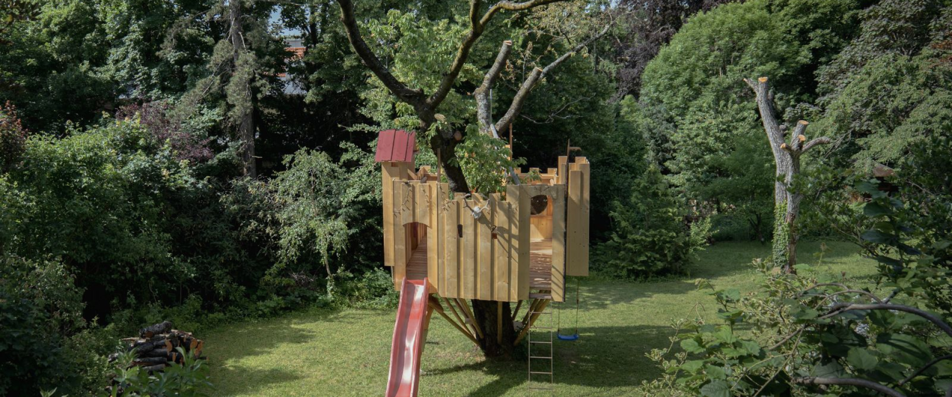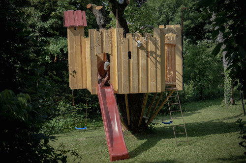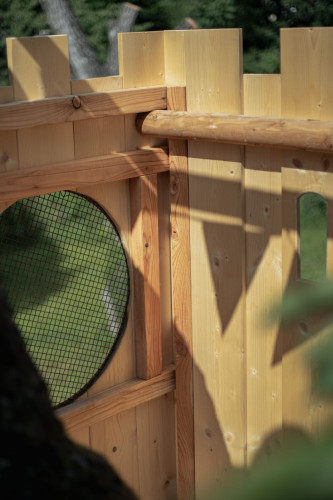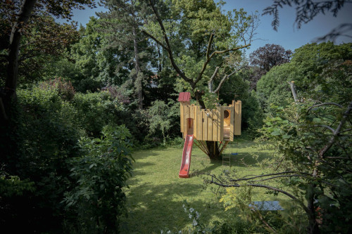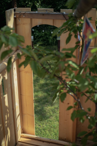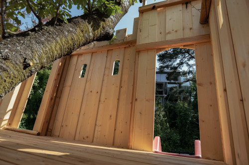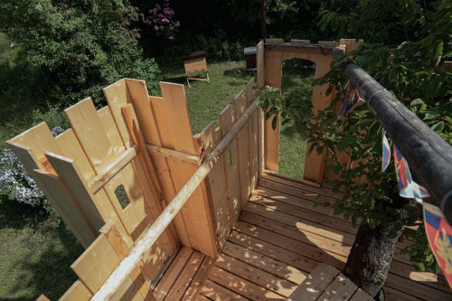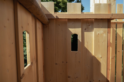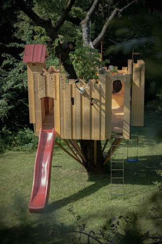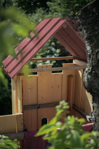 Das Spielgerät ist mit einer Feuerwehrstange, 10 Schiessscharten, einem Tisch, einer Rutsche, 2 Schaukeln und einem überdachten „Schmollturm“ ausgestattet. Und ich höre mit Freude, dass die beiden Jungs, 7 und 4 Jahre alt, den wunderschönen Garten wegen ihrer neuen „Hochburg“ öfter als bisher nutzen.