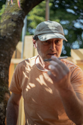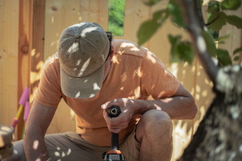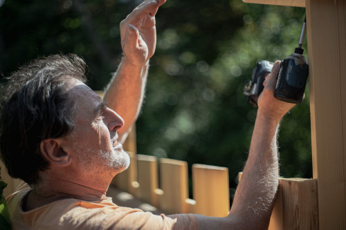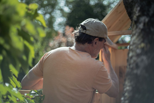 Im Laufe des Monats Mai gelang mir an mehreren Tagen, die „Hochburg“ zu errichten, bei der ich in Summe mehr als 2000 Höhenmeter, mit Werkzeug und Holz bepackt, zu bewältigen hatte. Der Baum ist nämlich nur über eine lange, steile Treppe erreichbar. Das Einkürzen der langen abgestorbenen Äste und Stämmlinge des Kirsch- und eines ebenfalls abgestorbenen Nussbaums verlangte viel Fingerspitzengefühl und nicht wenig Übermut, denn sie gefährdeten im Herunterfallen nicht nur mich, sondern auch diverse Beete und Büsche sowie drei Bienenstöcke. Ich hatte vor Angst weiche Knie bei dieser riskanten Arbeit.