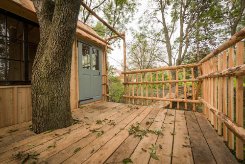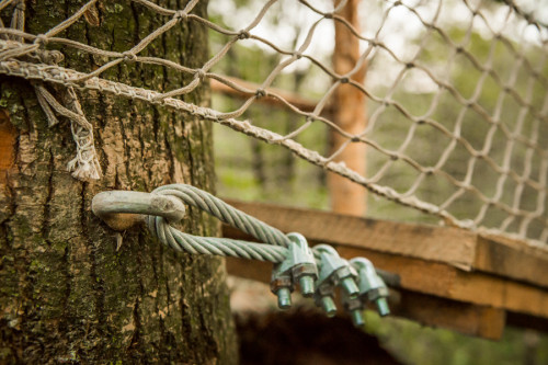 Als „letzten Schliff“ knüpfte Marie zur Erhöhung der Sicherheit Netze an die Seiten der Brücke, während ich Sprossen ans Geländer der Plattform schraubte. Auf der Südseite des Eschenstammes, welcher nunmehr aus der Mitte der Plattform ragt, entstand eine quadratische, rund drei mal drei Meter große Terrasse, von der man an Baumkronen vorbei auf eine große Wiesenmulde blicken kann, wo abends Hasen und Rehe austreten und die Bauernkatzen zur Mäusejagd schleichen.