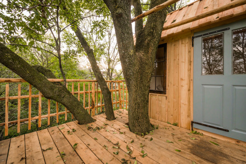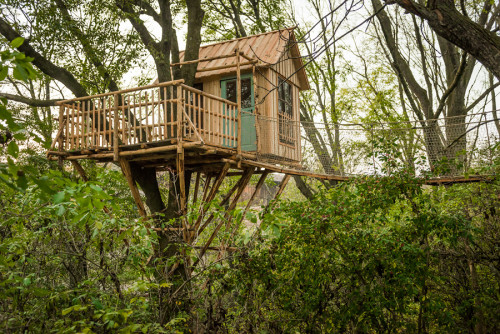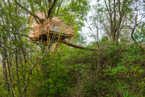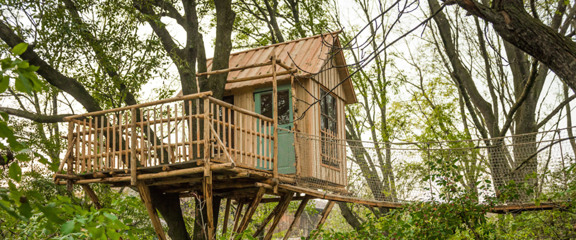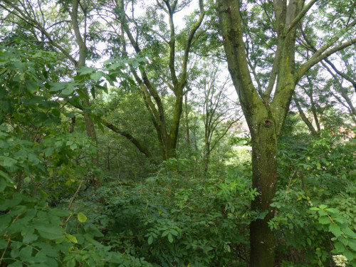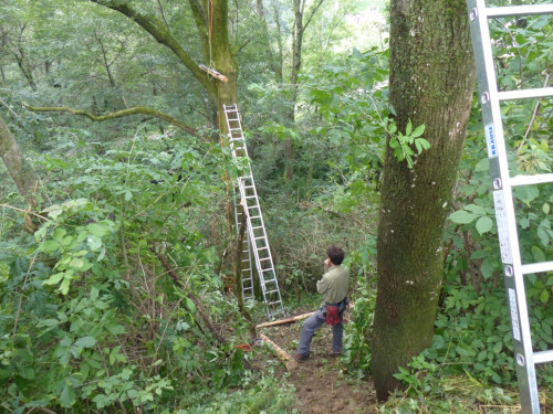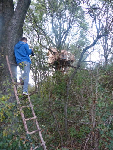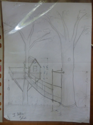 Am Rande des ebenen Obstgartens fällt ein ca. fünfzig Meter breiter, mit großen Eschen und niedrigem Holundergestrüpp bewachsener Abhang steil zum Bachgrund ab, wo man ein kleines Gerinne munter plätschern hört. Einige Stämme, die dort in lockerem Verbund wachsen, boten sich für ein Baumhaus an. Wir diskutierten die verschiedenen Möglichkeiten für dessen Errichtung, bis uns auffiel, dass eine der stattlichen Eschen durch eine Hängebrücke erreichbar wäre, deren zweites Ende man an einem weiteren Stamm, der fast parallel am oberen Böschungsrand wächst, befestigen könnte. Zwar müsste die Brücke hier rund 10 Meter Distanz überwinden, doch könnte man auf diesem Weg den schlammigen Abgrund trockenen Fußes bequem überwinden.