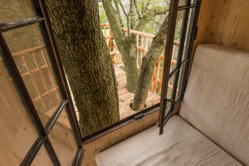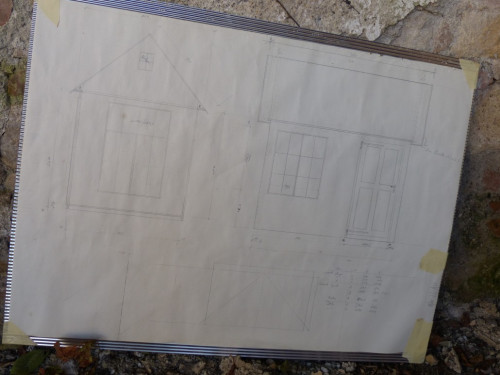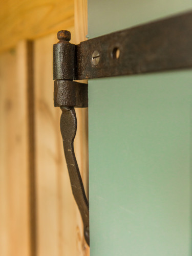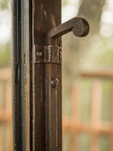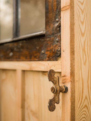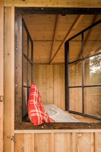 Die Hütte, die wir in meiner Werkstatt provisorisch zusammengebaut hatten, wurde zerlegt, in Einzelteilen angeliefert und steht nun auf der gegenüberliegenden Stammseite der Terrasse. Sie besteht aus unbehandeltem Lärchenholz und wird von zwei restaurierten, eisernen Fabrikfenstern durchlichtet. Die Eingangstüre, eine alte Holztür aus meiner Sammlung, erhielt einen taubengrauen Anstrich. Das Sofa lässt sich zum bequemen Doppelbett ausziehen, während noch genügend Platz für ein Tischchen, Stühle und ein Regal bleibt.
