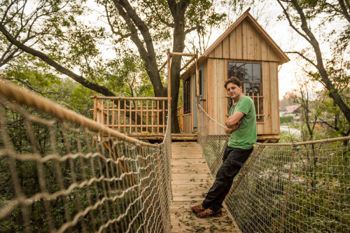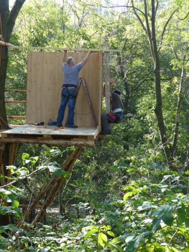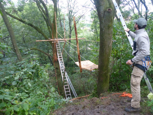 Nach drei regnerischen Tagen war die Hängebrücke begehbar und unsere Kleidung nass und schlammig. Wir waren verschnupft aber glücklich über unser gelungenes Werk. Nachdem uns ihr Schwingen inzwischen vertraut war, erwies sich die Brücke verglichen mit den gewohnten Leitern als bequemer, um diverse Bauteile von der Ebene auf die Plattform zu befördern, welche sich in rund acht Metern Höhe über dem Erdboden befindet.