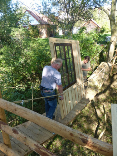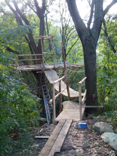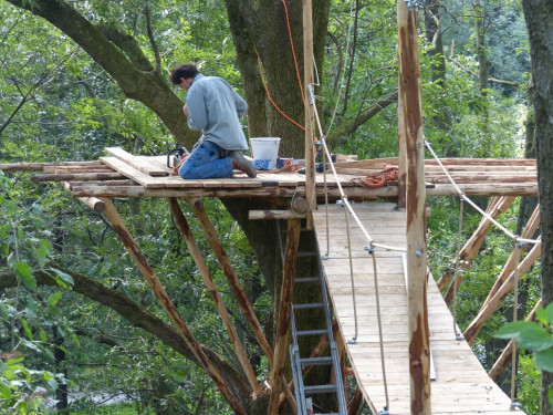 Die Idee fand sogleich Anklang, und es dauerte nur ein paar Wochen, bis ich mit einem bunt zusammengewürfelten Team mit dem Bau des Podestes aus entrindeten Lärchenstangen und der Hängebrücke aus Stahl- und Polyhanfseilen sowie Lärchenholzbrettern begann.
